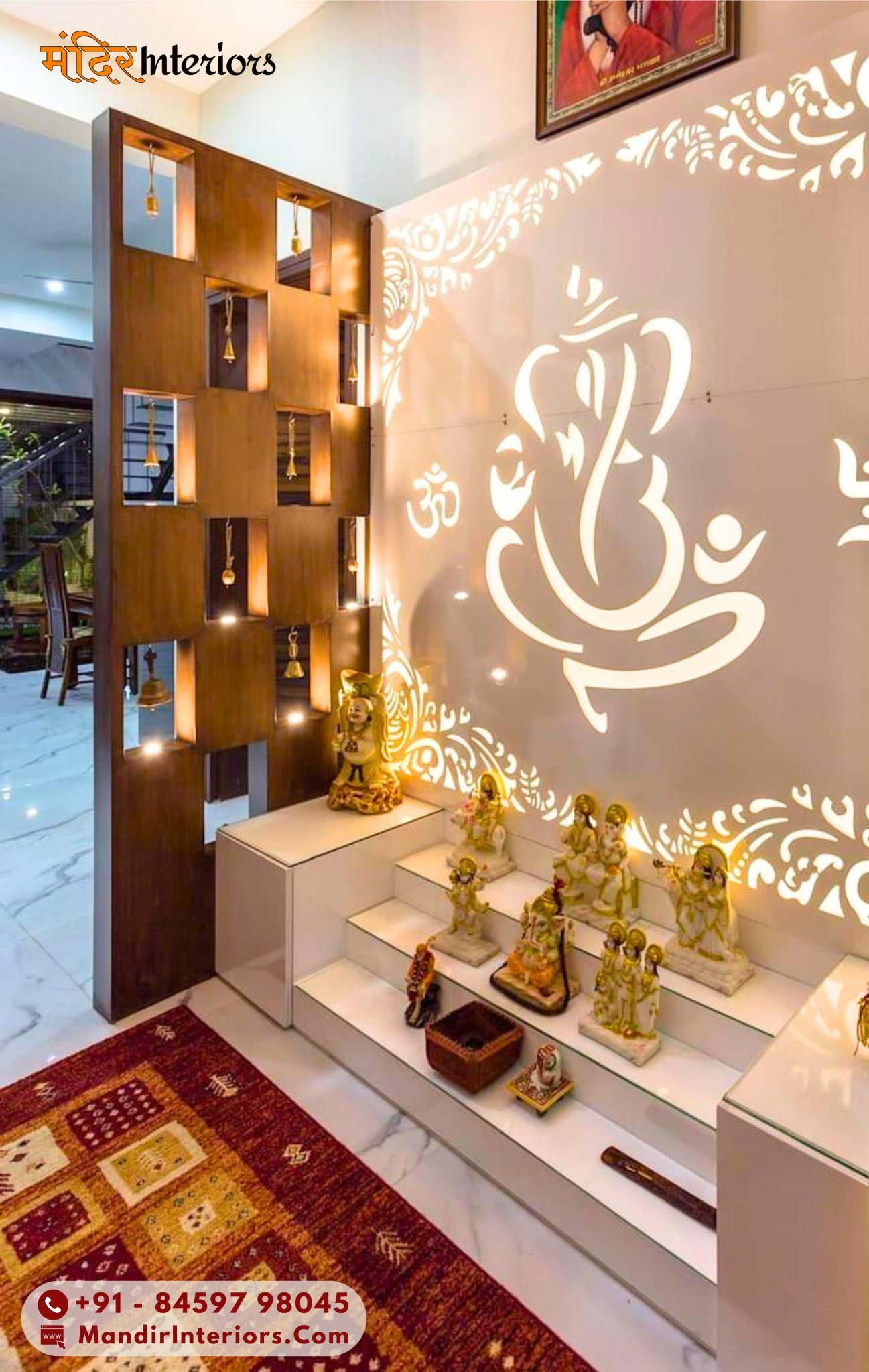 • West Delhi (Paschim Vihar, Punjabi Bagh, Rajouri Garden): High-end floor-standing temples with multi-layer 3D carvings and designer doors.