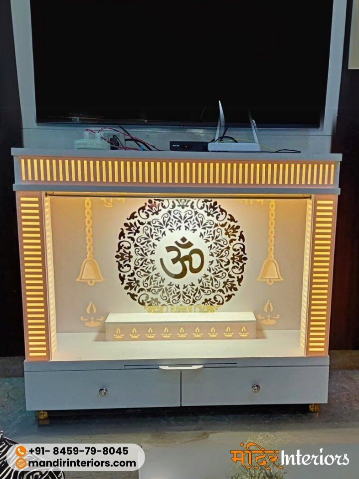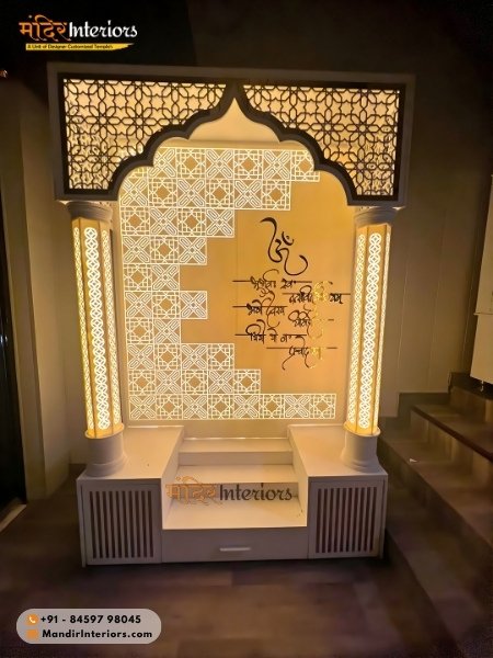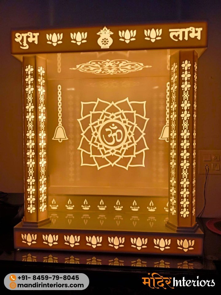 Small wall-mounted units start from ₹15,000, while medium-sized designer mandirs range between ₹30,000 to ₹80,000. Premium custom luxury units with 3D carvings, backlit, pillars, MOP work, inlay work etc., can go up to ₹2,50,000