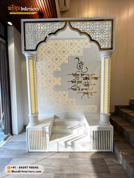 Most Corian mandirs in Delhi are sold with “backlit” features. Because Corian (especially the white/off-white shades) is translucent, LEDs are placed behind the CNC-cut Jali to create a soft, divine glow.